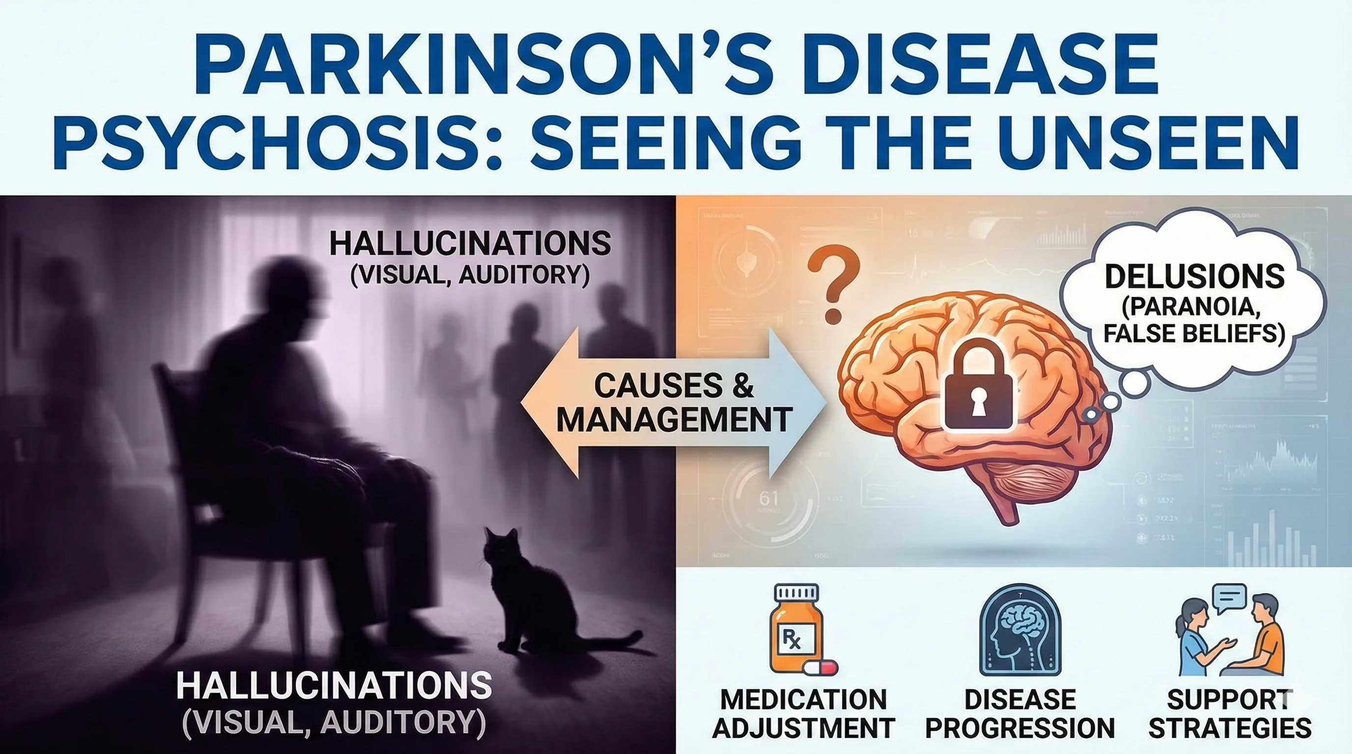 Hallucinations (seeing things that aren't there) and delusions (believing things that aren't true) are distressing symptoms that can occur in Parkinson’s Disease (PD), usually in later stages. This condition, known as Parkinson’s Disease Psychosis, is often caused by a combination of the disease progression itself and the side effects of dopamine medications. It is a major cause of caregiver stress but can be treated with medication adjustments and specialized antipsychotics.