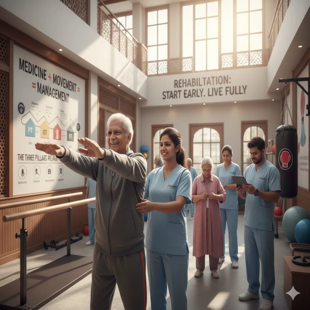 Rehabilitation is not just an "add-on" for Parkinson’s Disease (PD); it is as vital as medication. While drugs replace dopamine, rehabilitation trains the brain to use it efficiently. A comprehensive rehab program—including Physical Therapy (PT), Occupational Therapy (OT), and Speech Therapy (ST)—helps maintain independence, prevent falls, improve communication, and slow the progression of disability. The key is to start early, right after diagnosis.